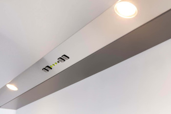 This 90cm telescopic cooker hood can be integrated flush with the wall cabinet and it has a compact motor which leaves space for herbs and spices in the unit above. The slider features a transparent glass visor and there are two 2.700K LED lights at the base. This model has button controls and three speeds plus a power boost function with an automatic downshift after 6 minutes with a maximum free flow rate of 605m³/h. It has a run on timer of 10 minutes, and a safety Auto stop after 3 hours. There is a cleaning indicator for the grease filter and it comes in extraction or recirculation options.